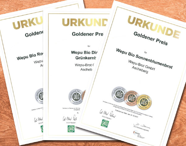 Die DLG (Deutsche Landwirtschafts- Gesellschaft), die als europaweit führende Institution ihrer Art jährlich die Qualität von rund 20.000 Lebensmitteln prüft, zeichnet unsere Vollkornspezialitäten regelmäßig mit Siegermedaillen aus – sichtbarer Beweis für überragende Leistungen bei Geschmack, Zusammensetzung und Beschaffenheit, akribisch geprüft von Sachverständigen für Brot und feine Backwaren. Desweiteren erhielten wir jährlich den „Preis der Besten“ – eine Auszeichnung für Spitzenleistungen bei den DLG Qualitätsprüfungen.